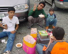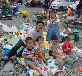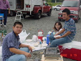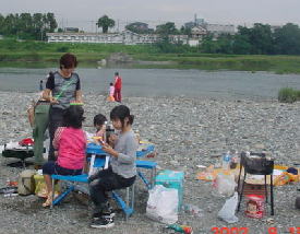 | とても広い河川敷で、あっちこっちでバーベキューやっていました。 | 幹事で大活躍してくれたKOMAちゃん(左) キャンピングカーで登場のみは♪さんです。 |