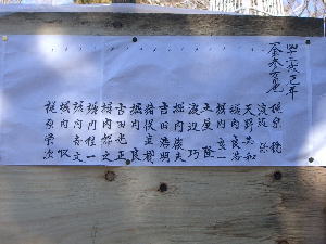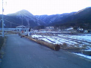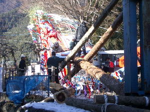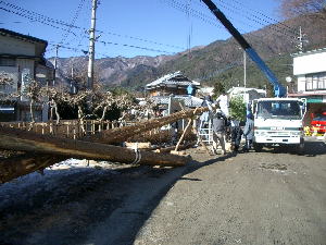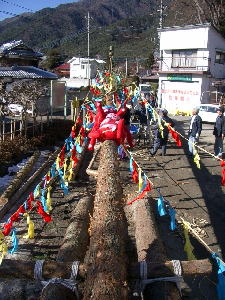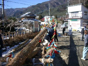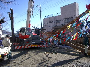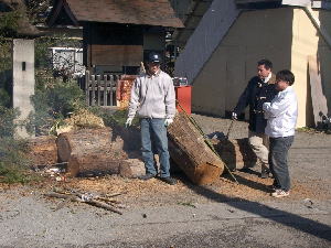 御神木は倒れた状態で高くそびえ立つその時を待ちます。 浅間神社の隣にある「大石紬伝統工芸館」の庭を利用します。