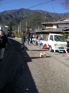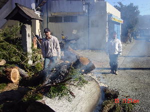 神社の前では太い木の根っこが燃え始めました。 その時を待つ42才のY君とM君、来年42才の世話人M君