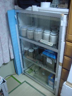 これだ! 縦:125cm、横:75cm、奥行:50cm 3段構成 枠はアルミ、壁はすべてガラス。 ガラスなので熱が逃げてしまうため全部発泡スチロールを装着。 この部屋は北西向きで、冬の朝は10℃前後になってしまうため幼虫飼育には向いていない。 しかし、今日から快適だ。 |
