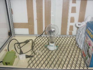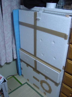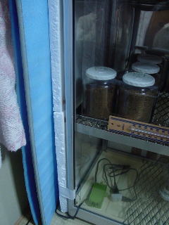 通常はこのように前も発泡スチロールで覆ってしまう。 保温と、明るさを遮断するため。 ガラス扉を開けてはいるが小型扇風機も設置したい。 |
