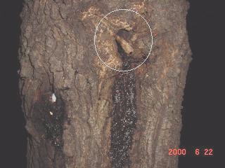 このクヌギだけは日に日に樹液が増えている(円内が6月5日にオオクワがいたところ)