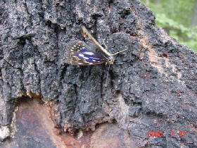 | 国蝶オオムラサキである。 ねばったが、羽を全部広げている姿はなかなか見せてくれないのだ。 風格と力強さを感じさせる魅力的な蝶だ。 |