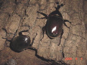 | ノコギリクワガタ♂♀である。しかし♂が小歯型でチビ助のくせに自分よりでかい♀に求愛している。 しかしこの小さい体では♀を押さえつけることはできず、早々に振られてしまった。 離れたところで♀だけGET。 家で飼育中の大歯型の2番目の奥さんにする。 それにしてもこの林でノコの生存が確認されたことは喜ばしい。 |