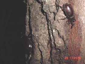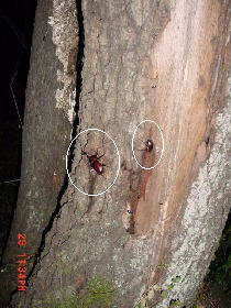 ノコの小歯型がゴキと仲良く樹液を吸っている。