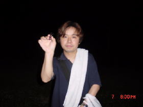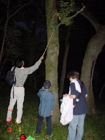 頭上にいる40mmくらいのコクワを採るT君(パパがんばって) 落ちるのをチェックするみなみさん