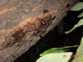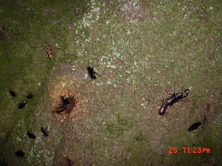 いるわいるわ、ご覧のとおり。 1本目のクヌギでざっと15匹、すぐとなりのクヌギにもざっと15匹。 カナブン並だ。