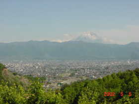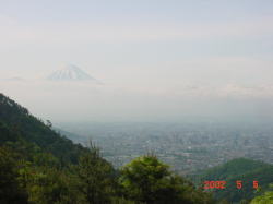 甲府盆地の向こうに遠く富士山が見える。 ここは夜景ポイントでもあるのだ。