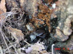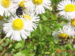 体じゅう泥だらけのコクワがちびちびと樹液を吸っている。 ハルジオンの花粉を吸うクロハナムグリ(左)とコアオハナムグリ(右)