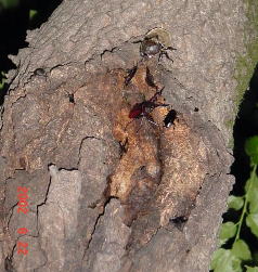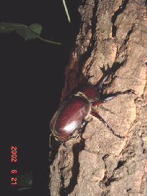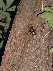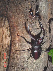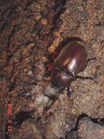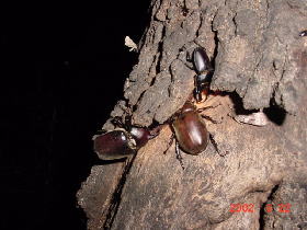 ノーチェックだったクヌギでカブトが一生懸命樹液を吸っている。 頭上にはノコ