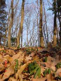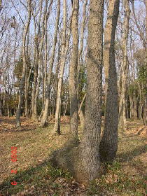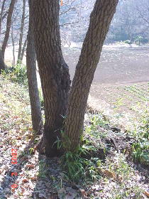 写真のように根元を手入れされて2本に伸びたクヌギが目立つ。