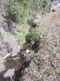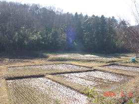 前夜に降った雨でたまった田んぼの水がきらきら輝いている。 田んぼの脇にはきれいな小川が流れている。