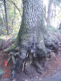 歩道のために地面が半分削られて根っこがむき出しになっているクヌギ。