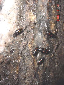 このクヌギの洞はゴキブリ天国。(^_^;) 根元は樹液が出ていて、コクワとヨツボシケシキスイがもぐり込んでいた。
