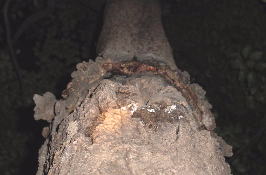 このクヌギは手を伸ばせば届く洞と、その上に頭上7〜8mの洞がある。