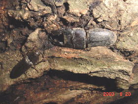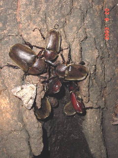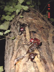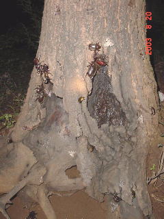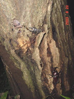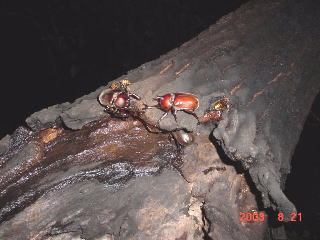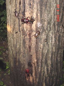 8月になってようやく樹液があふれてきた。 ほとんどがカブト。 ノコ♀が1匹だけ。