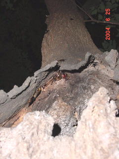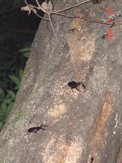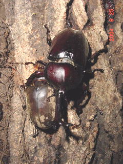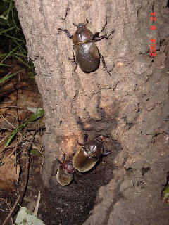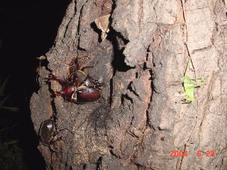 右写真、交尾するカブトの右は蛾を食べるヤブキリ。 樹液を吸わなくても樹液場へ現れる昆虫は多い。 たいてい蛾狙いのようだ。