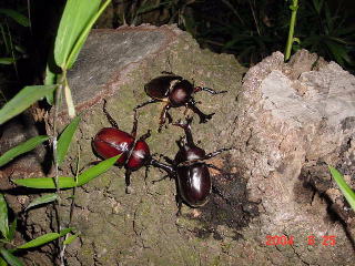 クヌギの切り株のちびちびした樹液に集まった3匹の♂。 ♀をめぐってひたすらケンカをしていたが、♀はあきれて去ってしまった。