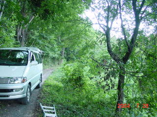 車の右に見えるコナラの樹上にオオムラサキが確認できた。