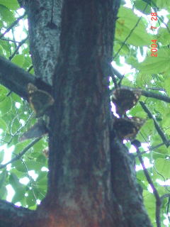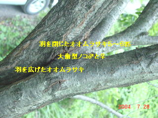 なんとか羽を広げている写真を撮りたいと思い、脚立を立てて樹上をのぞいてみた。