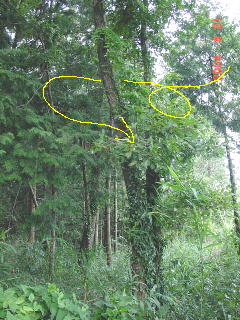 クロカナブンの案内がなければ絶対に見過ごしてしまうツタがからまった電柱クヌギ。
