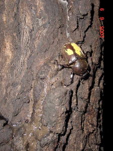 羽根が黄色! 外国産? ・・・コクワでした。 きっと誰かが観測(たとえば行動範囲、寿命等)のためにマーカーをしたのだろう。