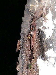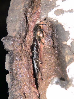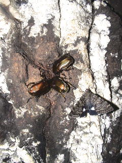 このクヌギもだいぶ樹液が流れているがカブトの♀1匹しか見えない。 めくれの一番奥を覗くとノコのペアが見えた。