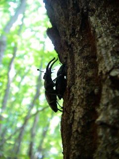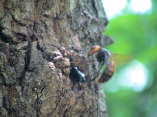 体長4cmの巨大なオオスズメバチが樹液の場所を占領しようとクロカナブンを執拗に攻撃し、引きずり出そうとしている。