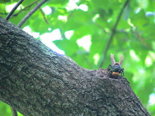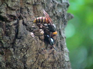 人間でも怖がるオオスズメバチだが、クロカナブンはお尻を向けて樹液に夢中でびくともしない。