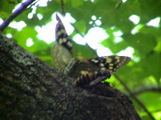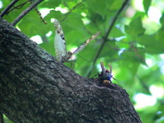 ふと頭上を見るともう1ヶ所樹液場があり、オオムラサキの♂が悠々と食事をしている。