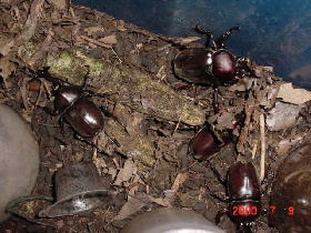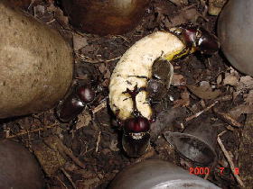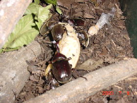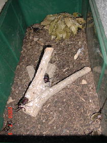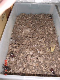 毎晩毎晩ケースのなかでガサガサ、ブンブン、ケンカはするわ、交尾はするわ、ものすごい状態だ。 すでに20頭程かみさんの友だちにもらっていただいたが、まだ60頭以上いる。 どうしようか・・・。