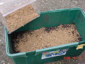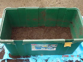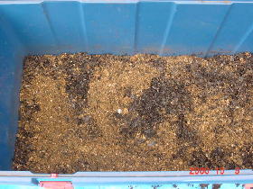 | 土状になった古い腐葉土を底に固く詰める。 さなぎ部屋を作りやすくするためだ。 |
