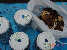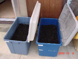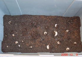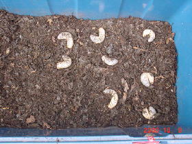 | Bケース シートの上にドバドバッ! | いるわいるわ、ウヨウヨウヨウヨ! 全部で77頭! 実家のおふくろと娘たちがいっしょに腐葉土をかき わけて手伝ってくれた。 |