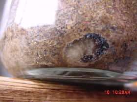 | ビンの側面にこのような状態になることはあるが、 蛹室はふちがきれいなラインになっているためすぐわかる。 幼虫にしわも寄っている。 小さめの♀だろう。 |