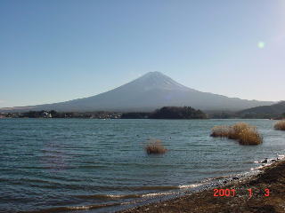 江間トンネルを抜けた途端、真っ白に染まった富士の雄姿! (手前の川は狩野川)
