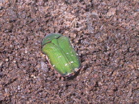 カナブンといっしょに樹液で見られるシロテンハナムグリはもっと深緑だ。