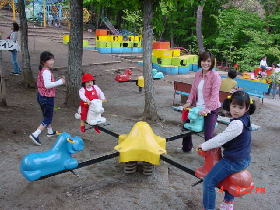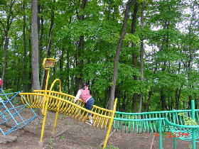 コナラ、アカマツ、クヌギの順で多い森だ。 多少の遊び用具はある。
