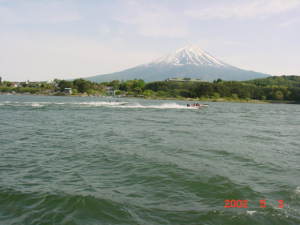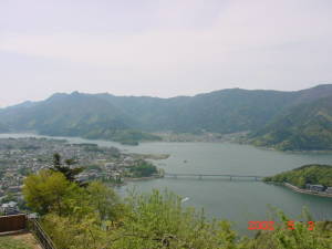 河口湖の全景。 画面中央の山のふもとが実家のある地区。